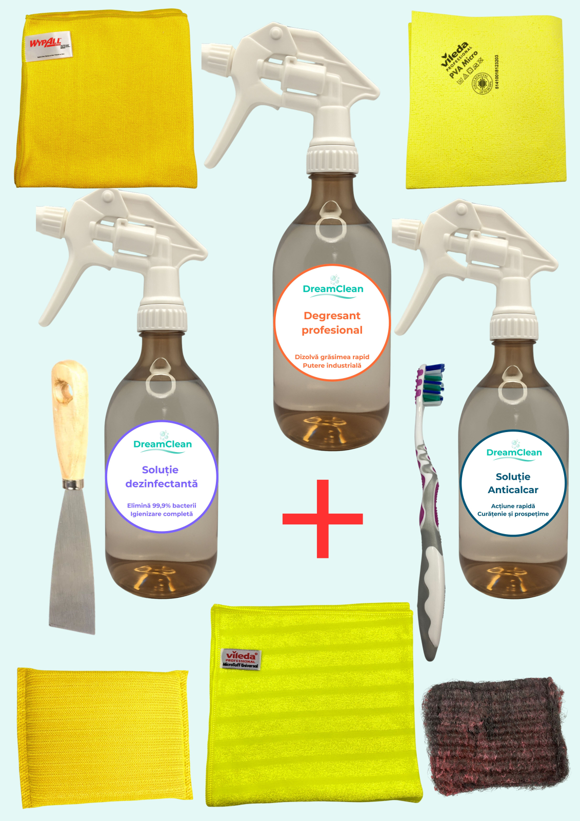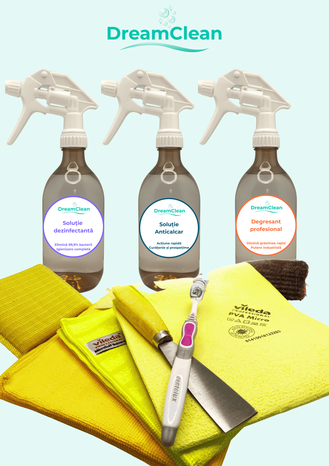 - Soluție Dezinfectantă DreamClean 500ml - Elimină 99,9% dintre bacterii și igienizează în profunzime. Recomandată pentru baie, toaletă, mânere, întrerupătoare și zone atinse frecvent.