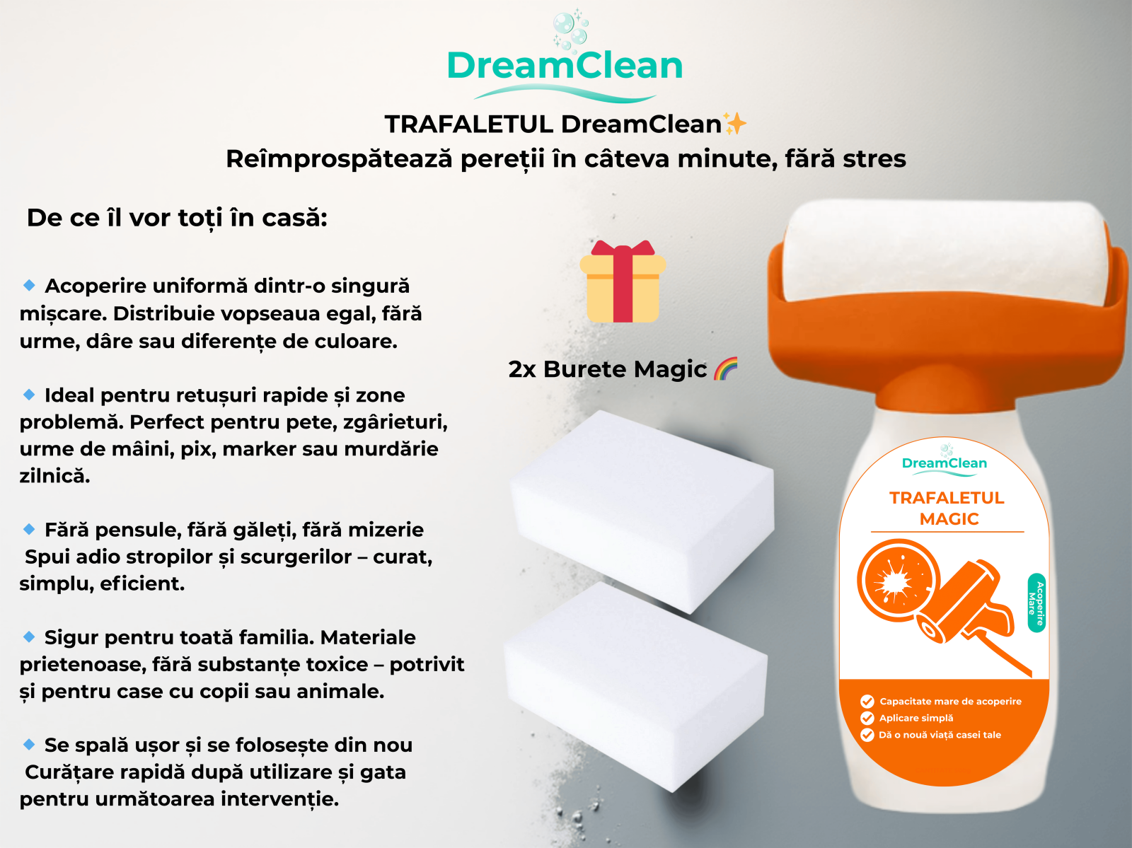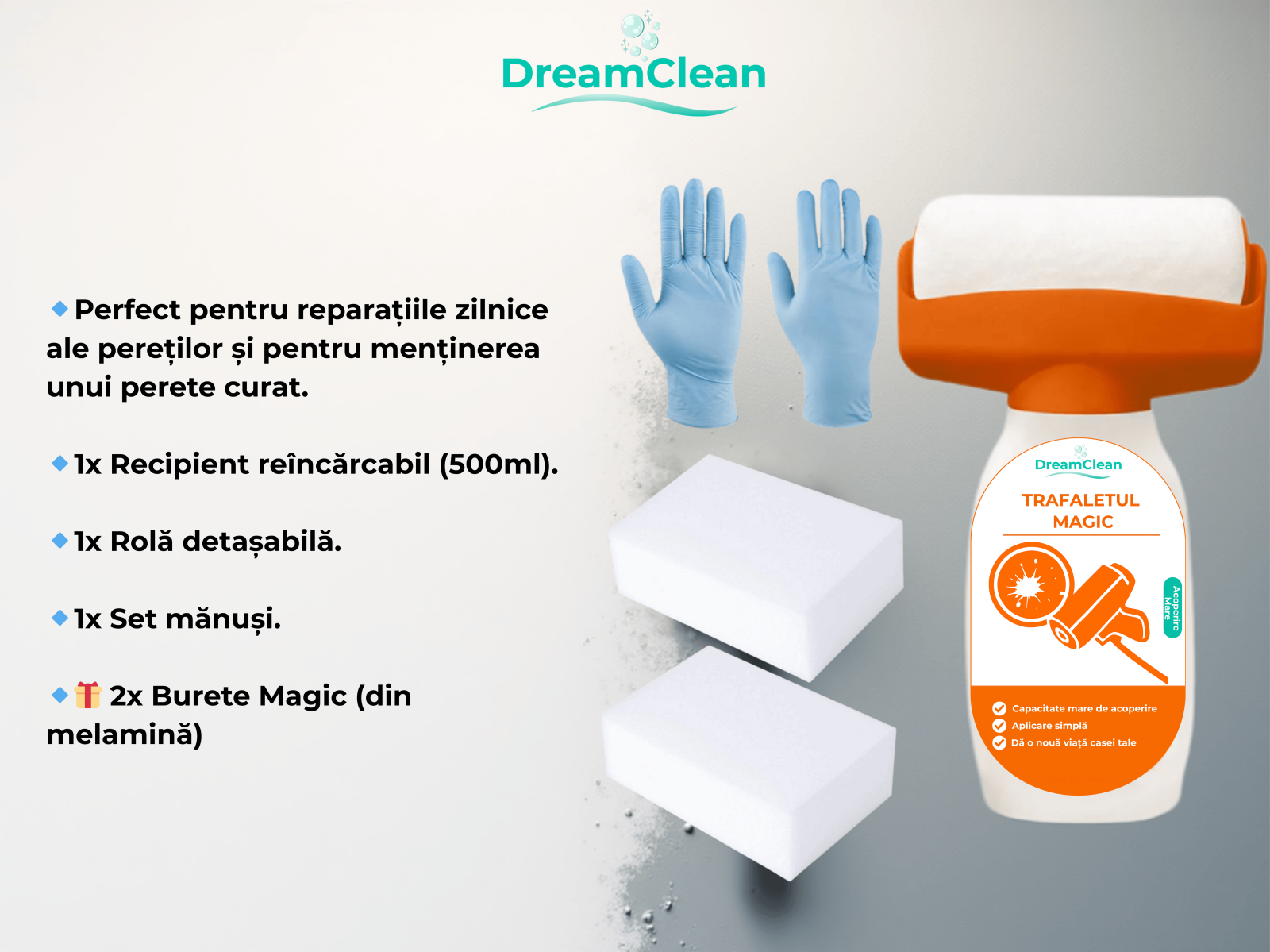„Peretele ca nou” este setul ideal pentru reîmprospătarea rapidă a pereților, fără renovări, fără mizerie și fără stres. Creat pentru uz casnic, dar cu rezultate vizibile imediat, setul îți permite să corectezi imperfecțiuni, pete și urme inestetice în doar câțiva pași simpli.